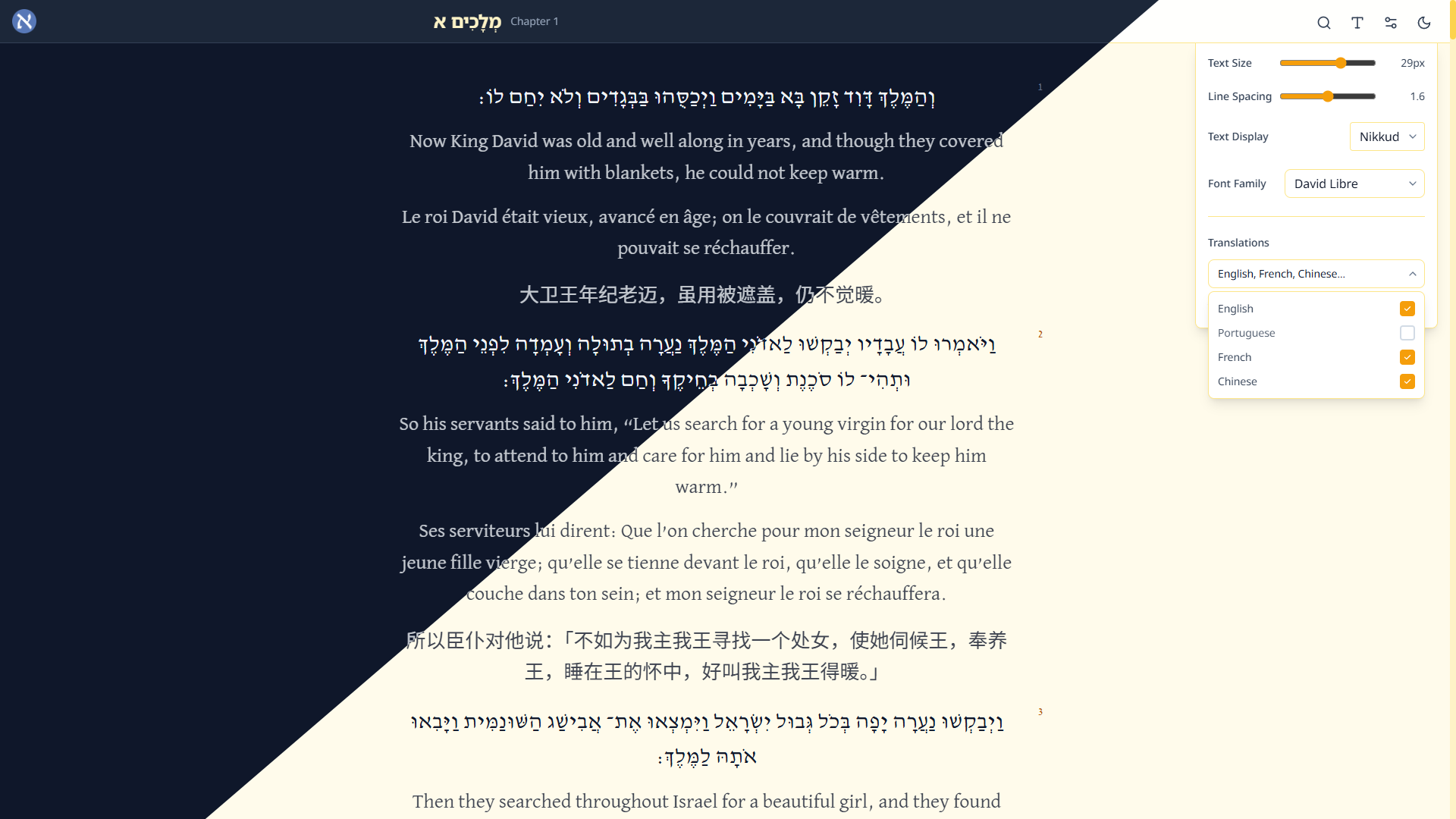A modern responsive reader of the Hebrew classics with multi-language translation, full book search, custom typography, “deep focus mode”, Gematria calculator, community commentary and more. Based on Leningrad Codex UXLC 2.4 (27.5). Tanakh Reader is free to use in browser or as progressive web-app. More info. (for the story behind this project see here).