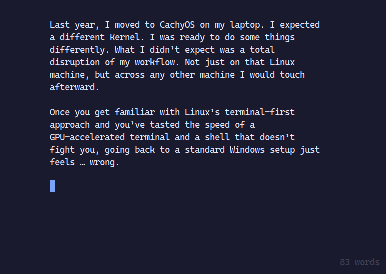 Once you get familiar with Linux’s terminal-first approach and you’ve tasted the speed of a GPU-accelerated terminal and a shell that doesn’t fight you, going back to a standard Windows setup just feels … wrong.